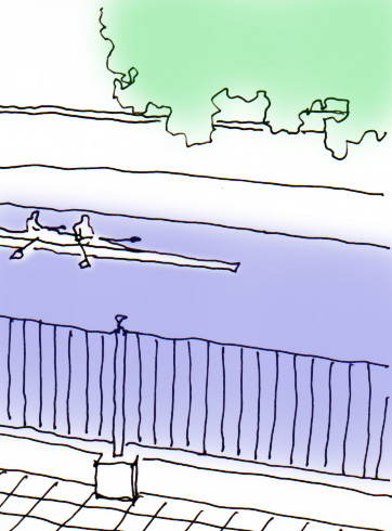 今日は、暑い。 ただ今、窓を全開にして仕事をしている。 今年の夏は意地でもクーラーを使わずに乗り切ろうと頑張っているから。 職場は川が近くにあるので、窓を全開にすると涼しい風が入ってくる。 と同時に、町の音も入ってくる。 丁度今聞こえてくるのは、女子ボート部の高校生のかけ声。 ボートを漕ぐペースに合わせて、リズム良く澄んだ声が耳に届く。 とても奇麗な通る声だから、クソ暑いなかでも悪くない。 男子のダミ声じゃなくて良かった・・・・ 画:hiromichi yasuda