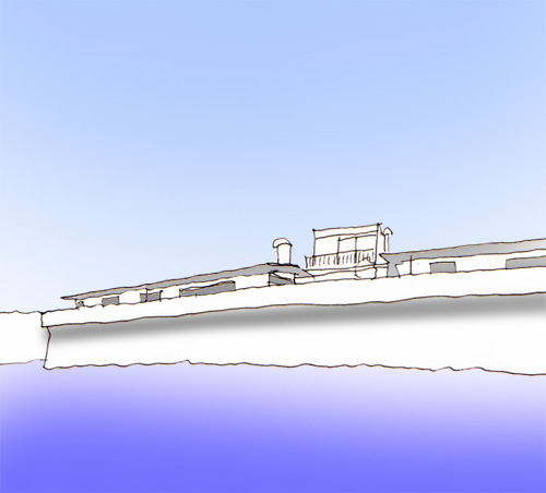 リビングに向かって若干床を下げているのと、天井(屋根)も見た目で判るように「ムクリ」があるので、懐の深い感じになっている。低い天井がむしろ心地よい空間になっていて、さらに海に向かって大きな窓があって、やっぱり低い軒先が、海の水平線と平行に風景を切り取っている。
