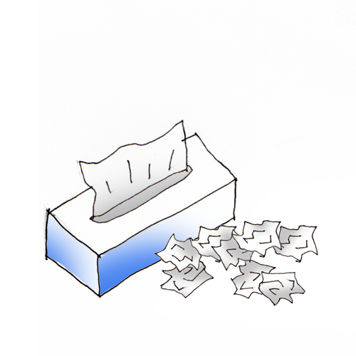 先日、図書館に行った時、相席となったテーブルの正面で女子高生が切なそうに勉強していた。次々と新しいテッシュを取り出しては鼻をかんで、テッシュの山を築いていた。
