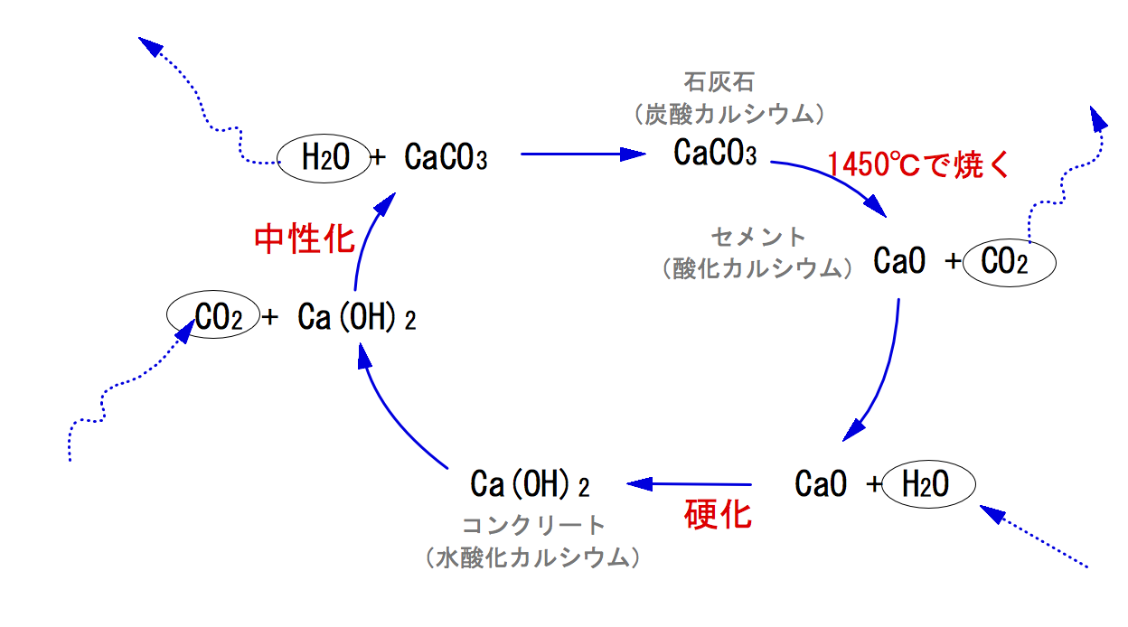 で、このOHを含むコンクリートは、時間が経つと大気中の二酸化炭素(CO2)と結合して、水と炭酸カルシウムになる。